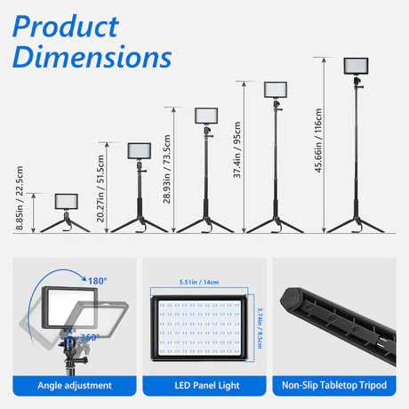 - Adjustable Positioning– Mount the lights directly to the mini tripods (minimum height: 8.85”/22.5cm) or use them together with the extension rods. Adjust the height from 8.85” to 3.8’ (22.5cm to 1.16m). It can be used as a desktop lamp or floor lamp as you like. And point the light panel to wherever you want using the ball head adapter.