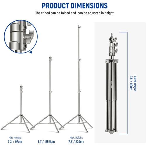 The Stainless Steel Photography Light Stand from Neewer extends from a minimum height of 3.2′ to a maximum height of 7.2′, offering a load capacity of 22 lb. It folds down to 2.6′ for easy storage and transportation. This stand features a reversible 1/4″-20 to 3/8″ stud adapter for wide compatibility with equipment and accessories.   In the Box Neewer Stainless Steel Photography Light Stand (7.2′) Limited 1-Year Manufacturer Warranty