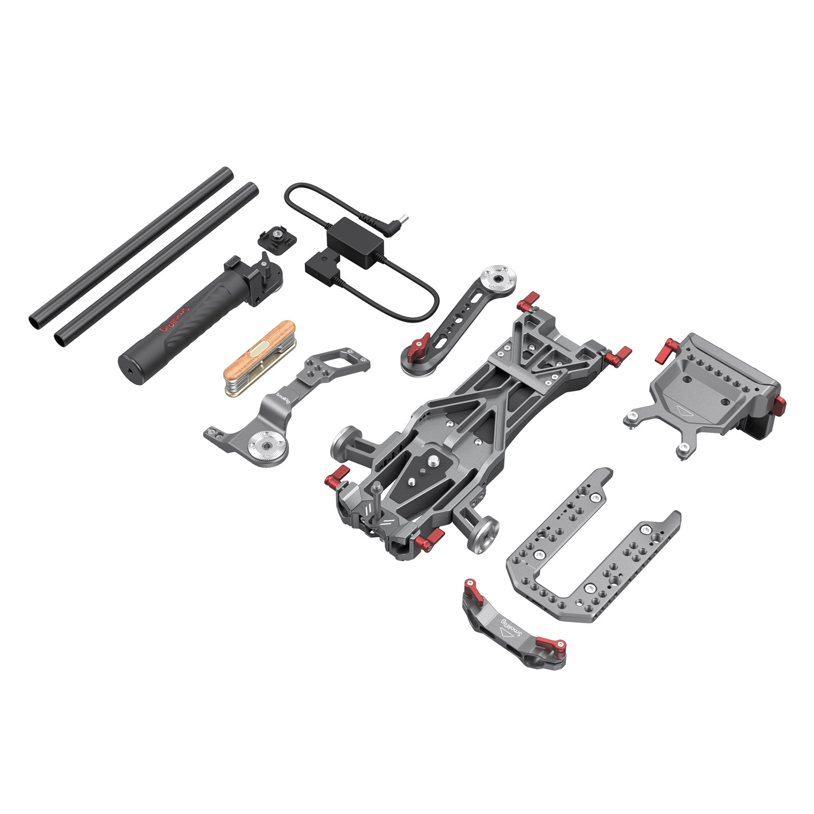 Le kit professionnel SmallRig SONY FX9 3057 est conçu pour protéger la caméra et offrir plusieurs points de montage. La plaque supérieure en forme de U est compatible avec la poignée supérieure d’origine SONY. Elle offre de multiples pas de vis 1/4”-20 et 3/8”-16 pour fixer des bras magiques tels que le modèle 2115. Ce type de design permet de passer rapidement de la prise de vue sur trépied à la prise de vue à l’épaule, afin d’économiser du temps lors du changement de mode de prise de vue. Le collier de serrage de rod de 15mm permet d’installer un support d’objectif, une bague de suivi et une matte box. Les poignées doubles offrent un meilleur contrôle de l’équilibre. Le coussinet d’épaule hautement élastique offre une expérience confortable pendant la prise de vue. La solution de batterie à dégagement rapide est installée à l’arrière du FX9, ce qui rend l’ensemble du système très compact et organisé. De plus, cette solution de batterie permet un accès rapide à la batterie V-mount et convertit la tension en 19.5V pour alimenter le FX9. Le kit comprend un ensemble d’outils portables et pratiques pour le démontage et le montage de la caméra.